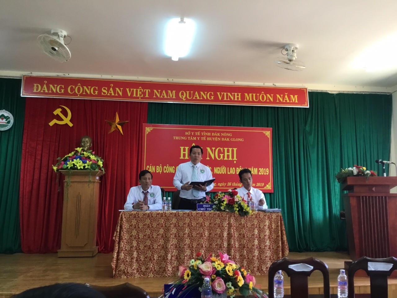Với ý nghĩa quan trọng đó ngày 26 tháng 02 năm 2019 Trung tâm Y tế huyện Đăk Glong đã long trọng tổ chức Hội nghị cán bộ công nhân viên chức năm 2019, về dự hội nghị có đồng chí Huỳnh Thanh Huynh, Bí thư Đảng bộ, Giám đốc Trung tâm và đồng chí Nguyễn Đức Quý, Phó Bí thư Đảng ủy, Chủ tịch Công đoàn cơ sở và cùng tất cả đoàn viên công đoàn trong đơn vị.