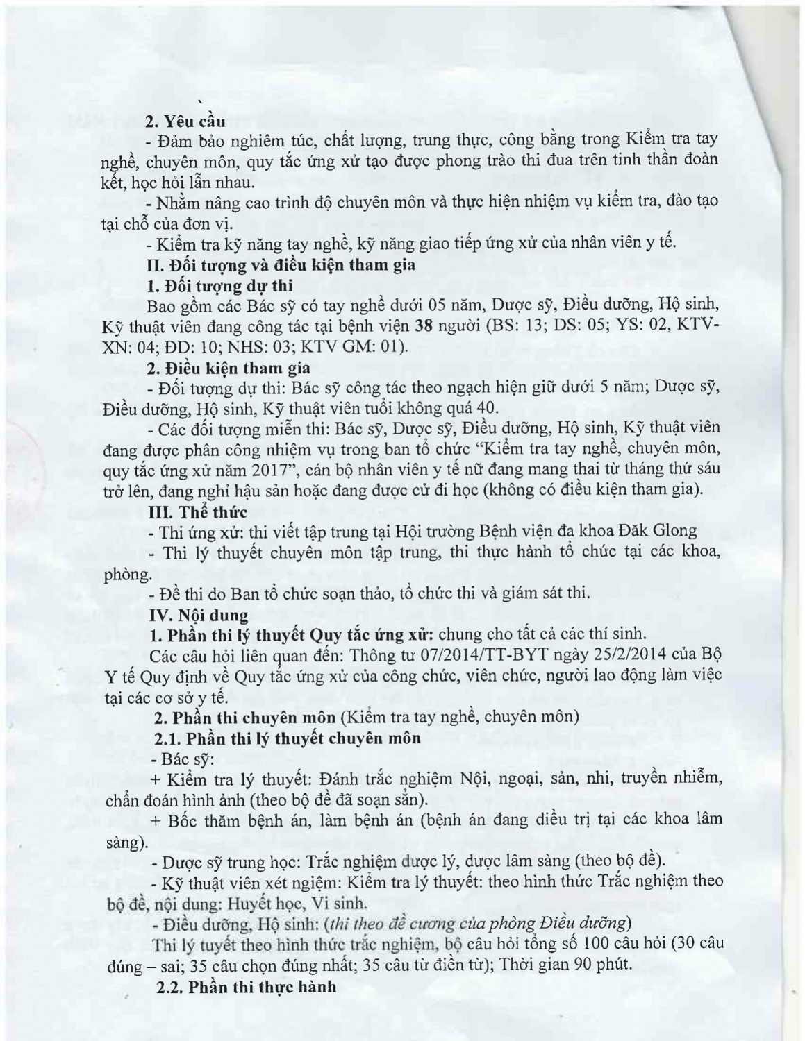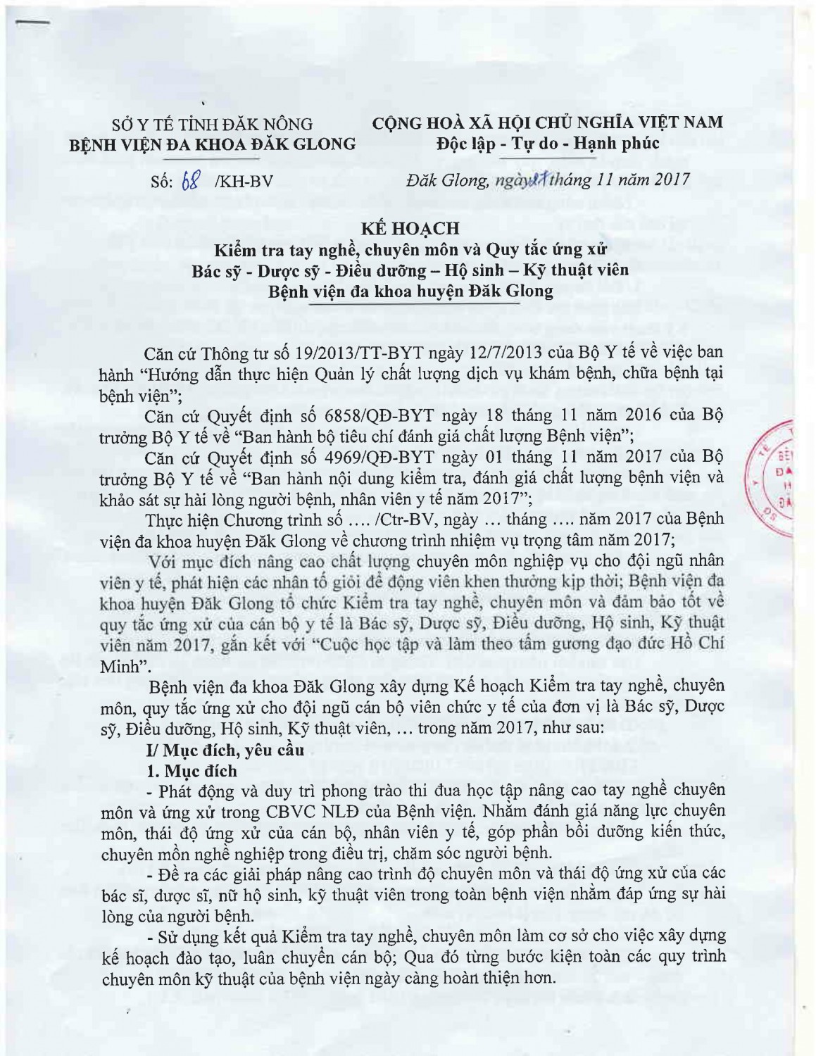 Kế hoạch kiểm tra tay nghề, chuyên môn và quy tắc ứng xử Bác sĩ - Dược sĩ - Điều dưỡng - Hộ sinh - Kỹ thuật viên Bệnh viện đa khoa huyện Đăk Glong