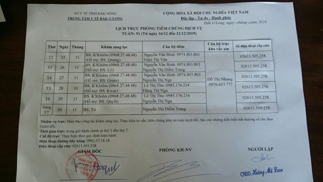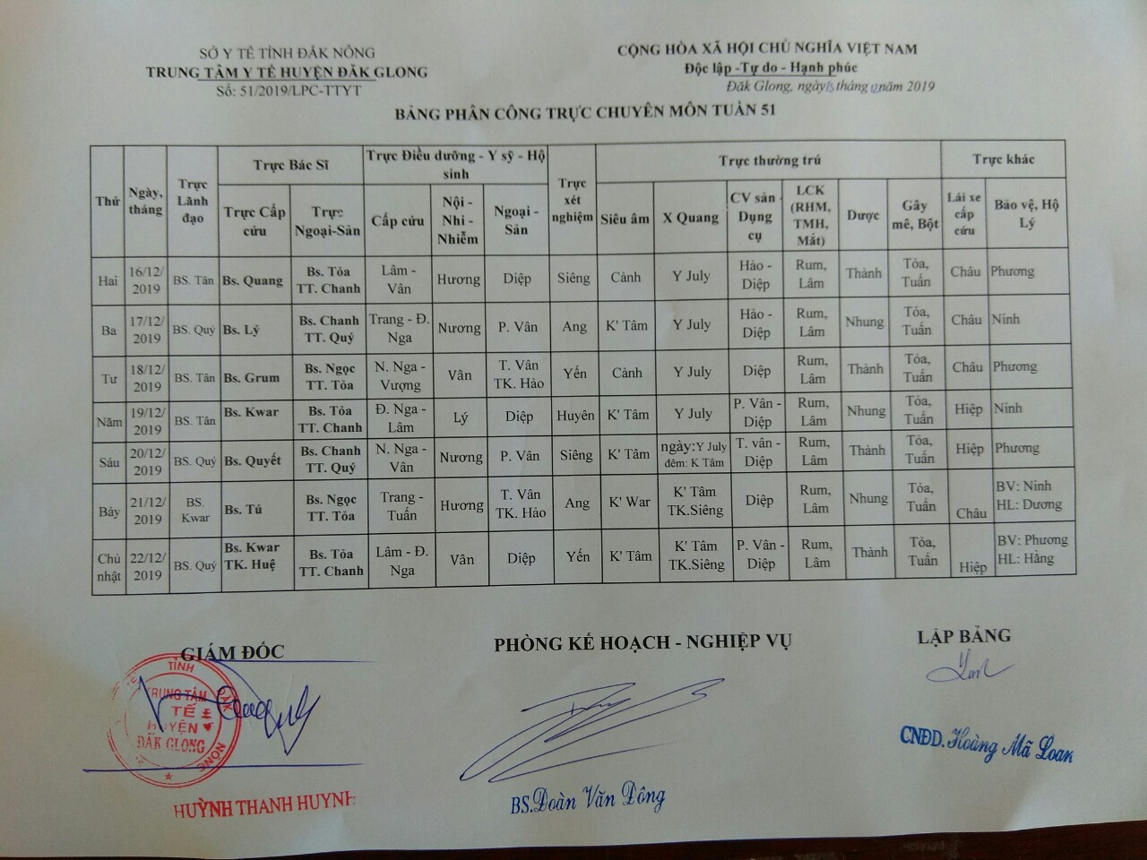 Lịch trục tuần 51 năm 2019