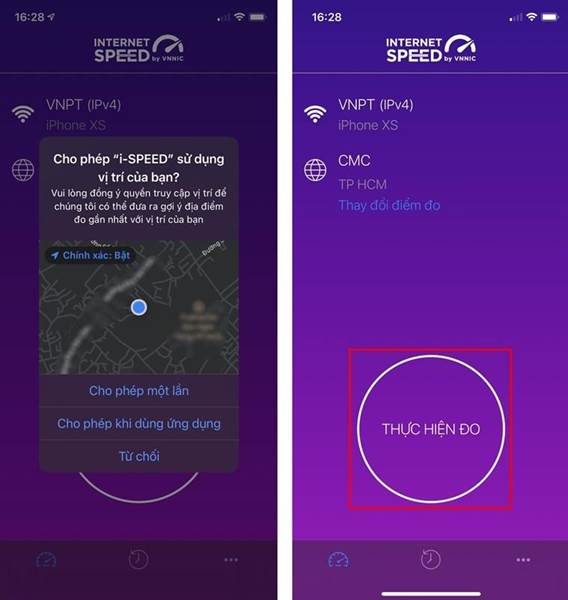 Bước 2. Mở ứng dụng lên, bạn cho phép quyền truy cập vị trí của ứng dụng. Tại màn hình chính, bạn nhấn Thực hiện đo để bắt đầu.