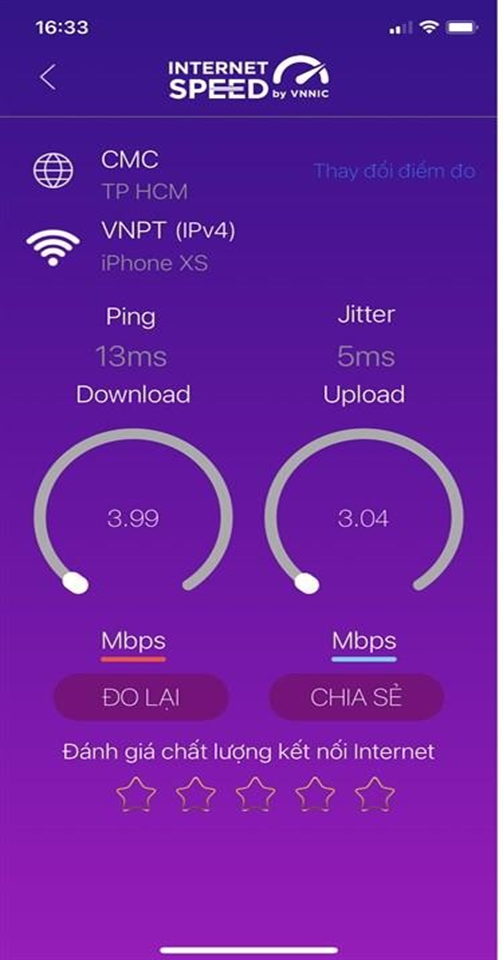 Sau khi thực hiện đo, bạn có thể thực hiện đánh giá chất lượng kết nối Internet và chia sẻ về Ứng dụng qua các mạng xã hội, nền tảng tin nhắn trên Internet (OTT)