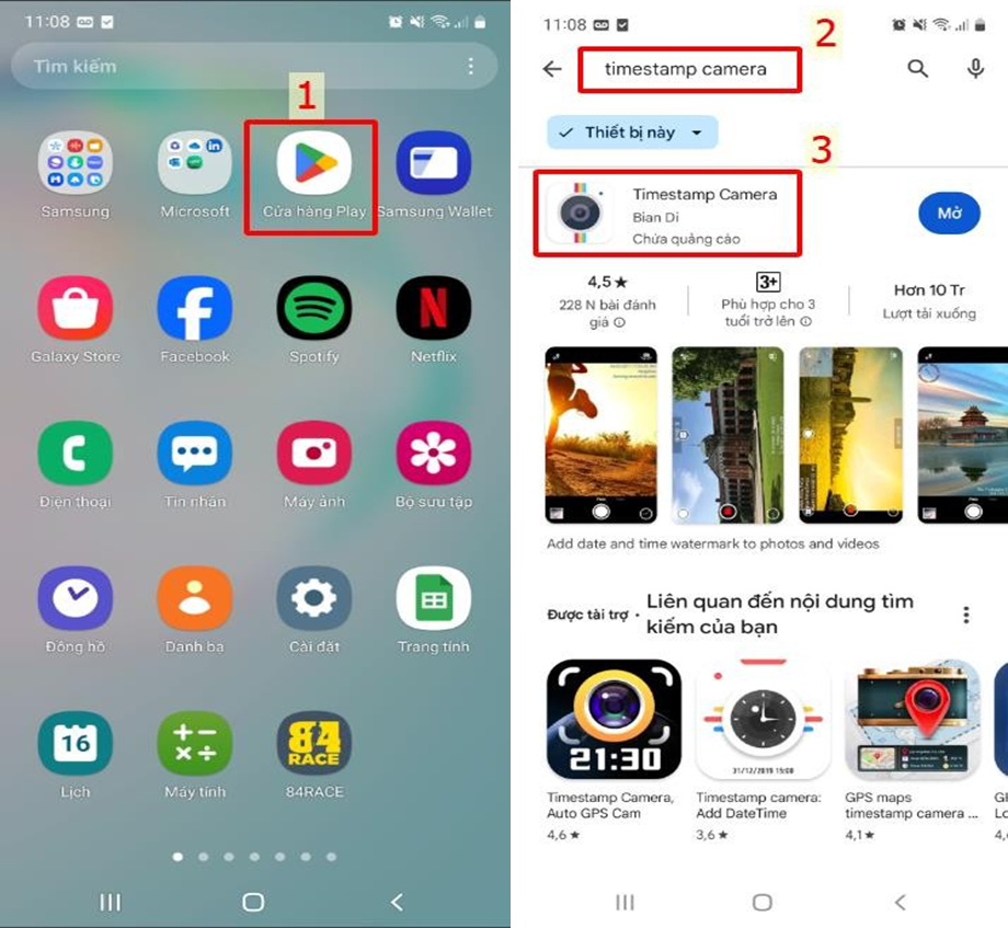 - Bước 1: Truy cập ứng dụng “Cửa hàng Play”, thực hiện tìm kiếm ứng dụng có tên: “Timestamp Camera Free” và tải về (Lưu ý: Quá trình tìm và tải ứng dụng phải thực hiện khi điện thoại ở môi trường có Internet có mạng 3, 4G hoặc Wifi)