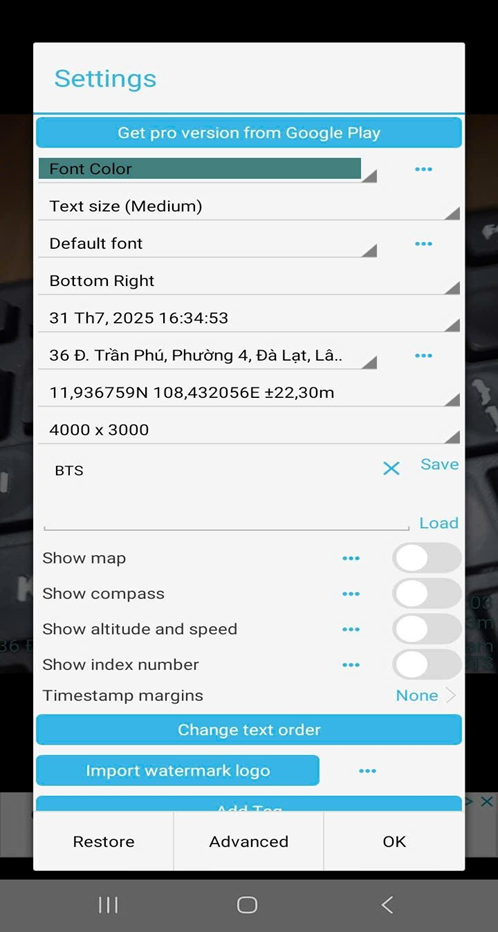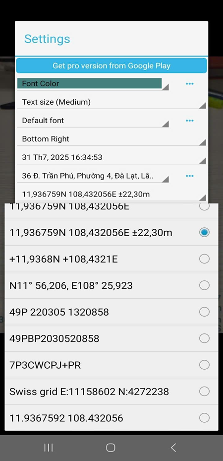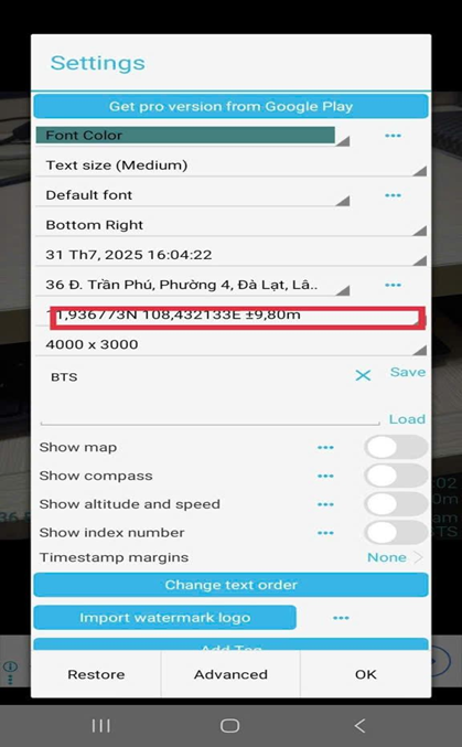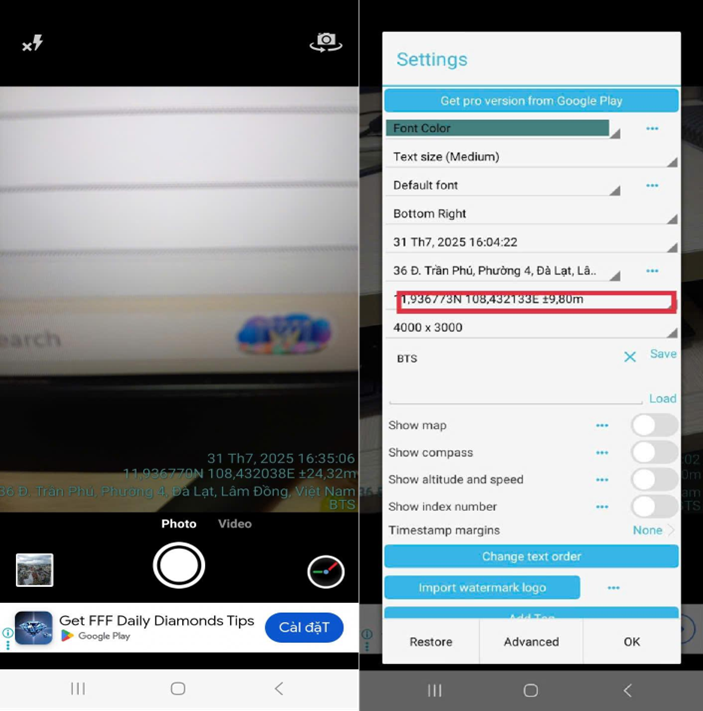 - Bước 2: Mở ứng dụng “Timestamp Camera Free” vừa tải về, kích OK tất cả các bảng báo hiển thị khi lần đầu mở ứng dụng. Chọn vào biểu tượng để thực hiện cài đặt đúng giá trị cần hiển thị (Yêu cầu: Chọn đúng dòng có giá trị như hình dưới (tọa độ hệ thập phân), cụ thể: 11,936673N 108,432133E