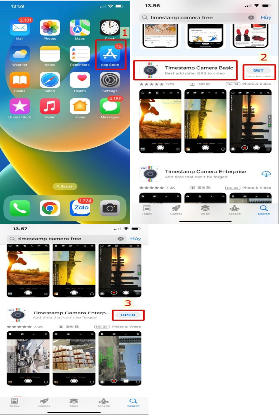 - Bước 1: Truy cập ứng dụng “App Store”, thực hiện tìm kiếm ứng dụng có tên: “Timestamp Camera Basic” và tải về (Lưu ý: Quá trình tìm và tải ứng dụng phải thực hiện khi điện thoại ở môi trường có Internet công nghệ mạng 3G, 4G hoặc Wifi)