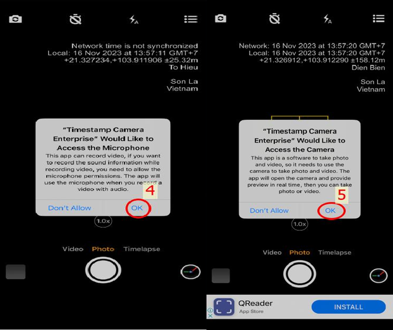- Bước 3: Thực hiện chụp ảnh, lấy tọa độ theo yêu cầu. Lưu ý: Để máy điện thoại nhận GPS trong khoảng 10s và ảnh chụp chỉ số sai sót buộc phải <