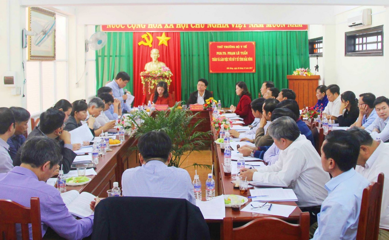 Chiều 26/12/2017, Đoàn công tác của Bộ Y tế do PGS-TS Phạm Lê Tuấn,Thứ trưởng Bộ Y tế làm trưởng đoàn đã có buổi làm việc với Sở Y tế tỉnh Đăk Nông về tình hình triển khai công tác khám chữa bệnh, giá dịch vụ và thanh toán bảo hiểm y tế.Tham dự buổi làm việc có đồng chí Tôn Thị Ngọc Hạnh - Tỉnh ủy viên - Phó Chủ tịch Ủy ban Nhân dân tỉnh, Ban lãnh đạo Sở Y tế và đại diện các đơn vị trực thuộc.